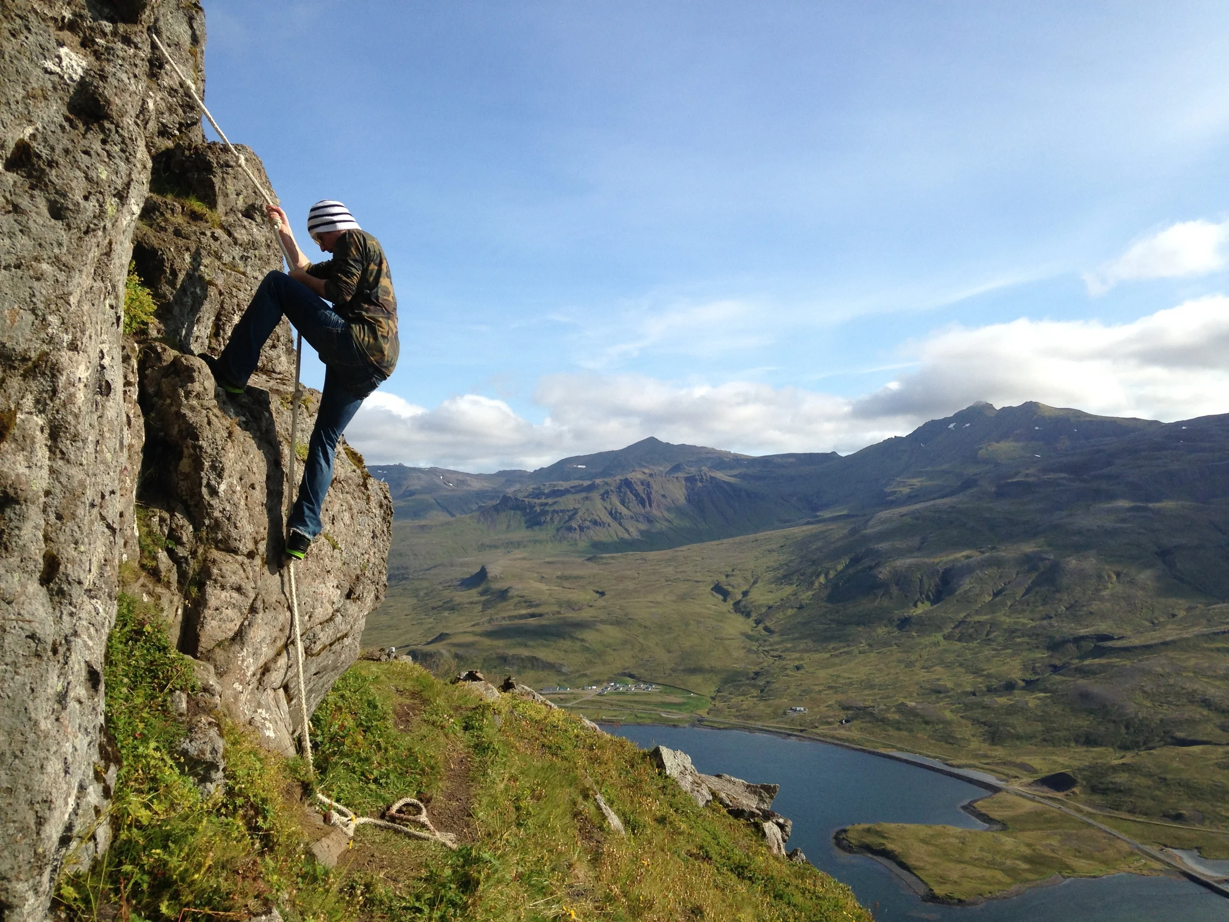 We woke up to crystal clear skies and warm sun. Since we didn't have any cell service or Internet we couldn't research the route to the summit. None of the locals really knew much about it either. So we just went straight up. There was no beaten path and there were several sections that required some bouldering skills. At the top shelf there was some sketchy rope tied to help climb the last 3 sections. I reluctantly trusted the ropes and, once at the top, noticed that they were not anchored to anything very sturdy.