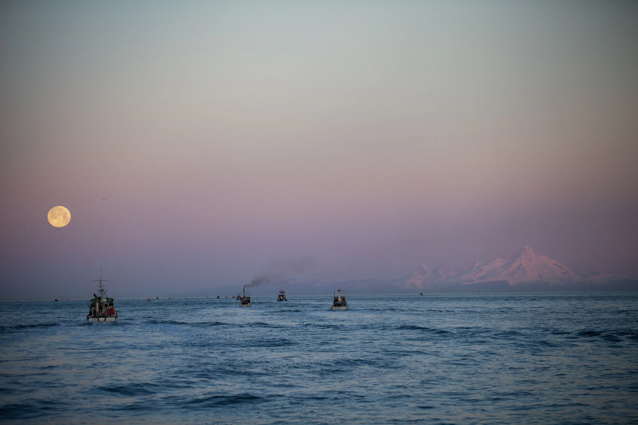 Departing from the mouth of the Kenai River, a fleet of commercial fishing boats head out at dawn towards the lower Cook Inlet in order to make it to the permitted fishing zone that is decided where and when drift netting can take place for salmon. Mount Iliamna, a stratovolcano covered by a glacier, towers at an elevation of 10,016 ft in the right of the frame.